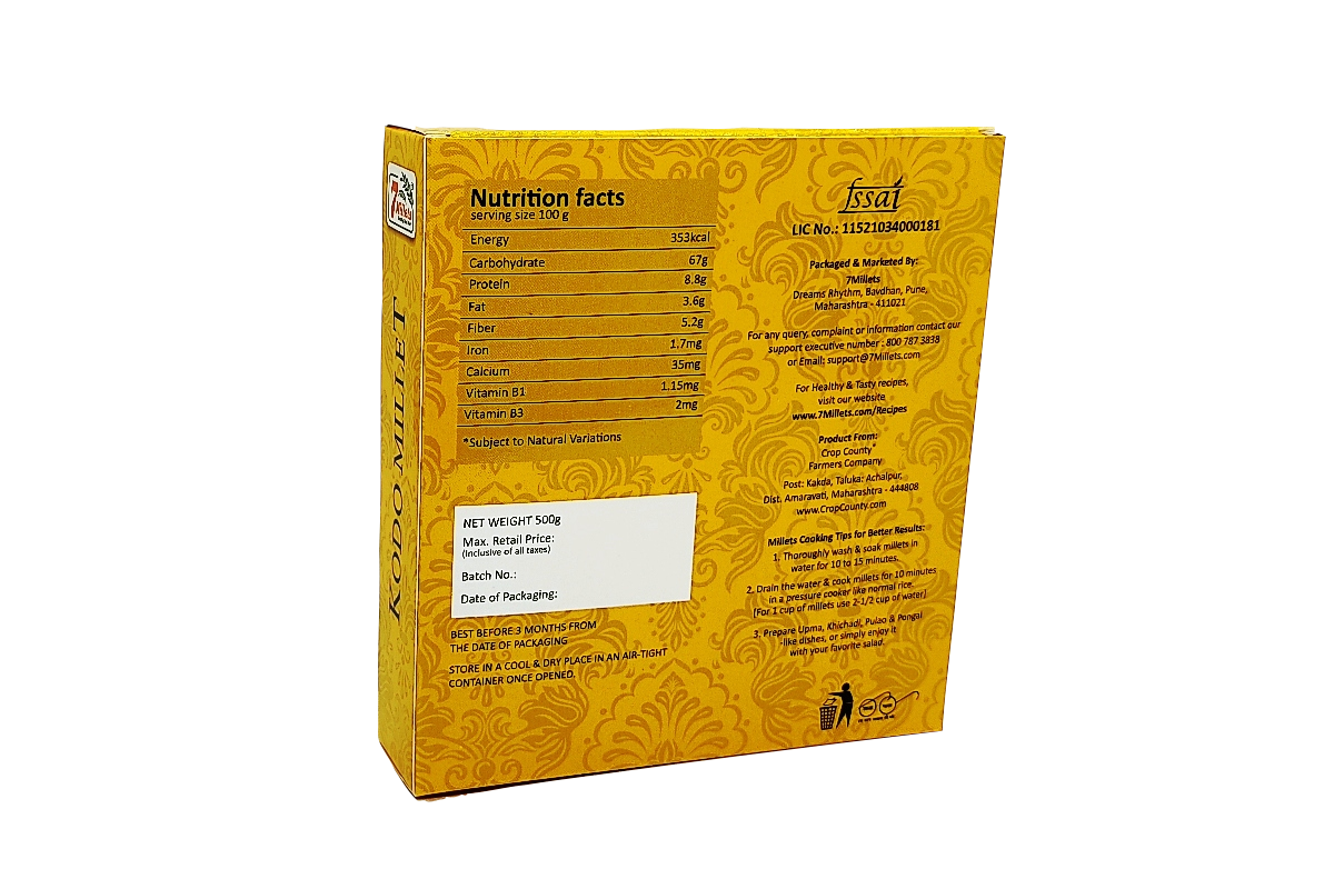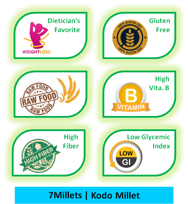 Kodo releases glucose slowly thus helping in sugar control. Kodo millet is rich in antioxidants and rich in dietary fiber. It is a good source of vitamin B6, Niacin, folic acid, and minerals such as calcium, iron, magnesium, and zinc.